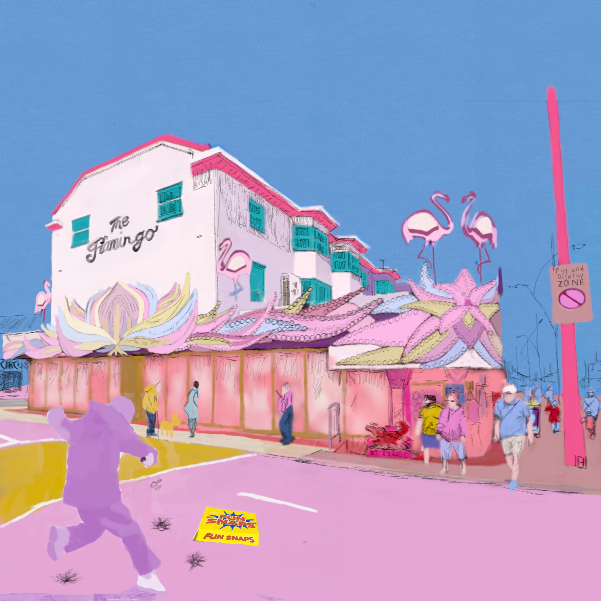 The Flamingo arcade in Great Yarmouth, Norfolk, with a boy banging fun snaps and jumping over a puddle. Messing with bold blocks of colour, rather than my usual more sketchy outlines. Part of an ongoing project on illustrating Great Yarmouth.